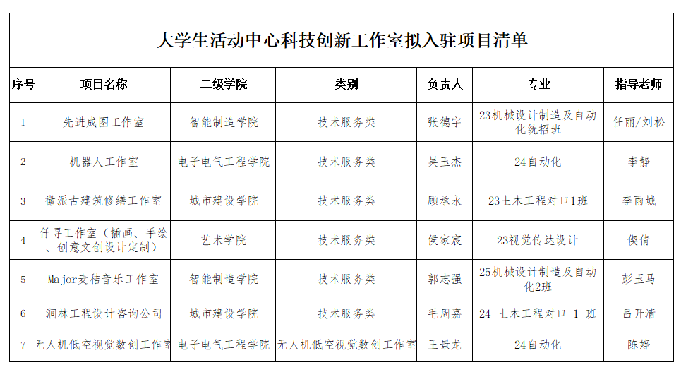 为进一步推进我校创新创业教育工作,鼓励和扶持各二级学院科技创新成果转化。根据《关于征集2026年春季大学生创业孵化基地项目入驻的通知(创字[2025]4号),将遴选大学生活动中心科技创新工作室拟入驻项目及有关事项通知如下。