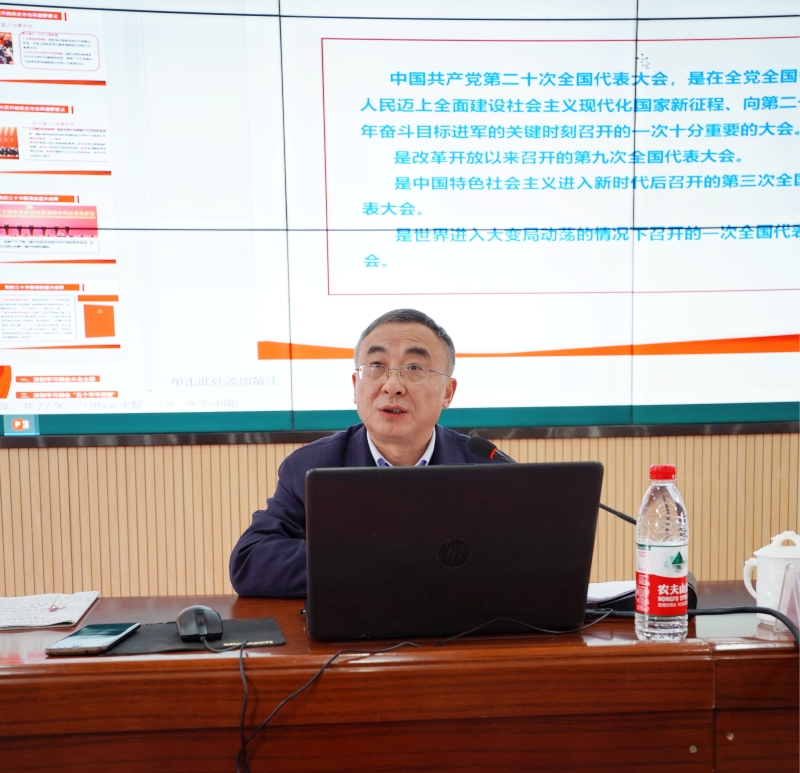 王先俊以《深入学习宣传贯彻党的二十大精神》为题,从深刻领会大会主题、深刻领会“五个牢牢把握”、兴起学习贯彻热潮三个方面,结合高等教育工作实际,对党的二十大精神进行全面宣讲和深入解读。他概述了党的二十大报告的基本框架和主要内容,阐释了党的二十大召开的历史方位和重要意义。