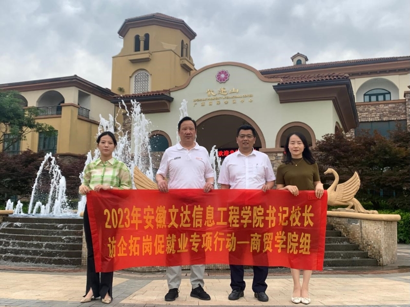 为进一步加强人才供需精准对接,拓宽毕业生就业渠道,5月16日,副校长胡善风率队前往安徽美磁置业有限公司紫蓬山广源国际会议中心分公司开展“访企拓岗促就业”专项行动,商贸学院党总支书记、执行院长刘欣,党总支副书记、副院长李爱萍,团总支书记桂梦玲参加走访。