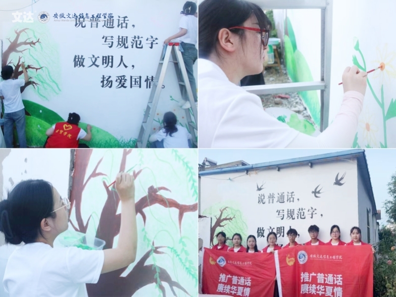 绘爱于村,墙画推普。为更好地将推普工作落实到广大群众中去,实践团在与费岗行政村委会干部交谈中了解到,当地村民组急需具有美丽村庄特色、反映当地风貌的墙绘创作。了解墙体基本情况后,队员们依托当地自然风光和人文资源,结合乡村生态文明建设和推普主题,充分发挥自己的聪明才智。盈盈绿草衬托着花团簇簇、蜻蜓伴随着蝴蝶翩翩起舞、和风飘扬的柳絮迎接燕子的归来,一幅幅生动的形象跃然于墙面上。“说普通话,写规范字,做文明人,扬爱国情”16个大字更是坚定了实践团“推广普通话,赓续华夏情”的决心。队员们以墙为布,绘制出了一面春意盎然、生机勃勃的风光景象。在墙绘过程中,不断有村民驻足欣赏,对学生们的创意和努力给予了高度肯定。墙绘工作的完成不仅美化了乡村环境,还让村民意识到学好、用好国家通用语言文字的重要性,更让铸牢中华民族共同体意识的思想进一步深入到村民心中,为村民提供一个干净舒适的生活环境,营造了积极向上的文化氛围,对凝集民心、文化振兴起到积极地推动作用。