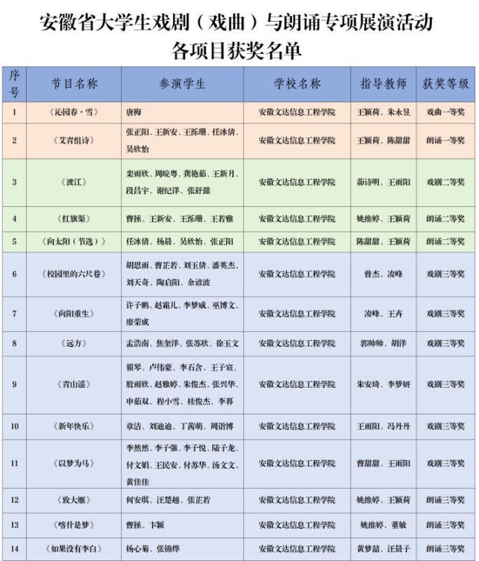 近日,安徽省大学生戏剧(戏曲)与朗诵专项展演活动评选结果公布。我校艺术学院报送的14个节目全部获奖,其中一等奖2项、二等奖3项、三等奖9项。