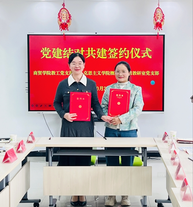 为深入落实立德树人根本任务,创新党建工作模式,推动思政课程与课程思政同向同行,10月29日下午,商贸学院教工党支部与马克思主义学院概论和形策教研室党支部举行党建结对共建签约仪式。商贸学院党总支书记栾敬东、马克思主义学院党总支书记张道全、商贸学院教工党支部书记孟范范、马克思主义学院概论和形策教研室党支部书记康欣莉、双方支部支委委员及部分党员代表出席本次活动。活动由商贸学院党总支副书记李爱萍主持。
