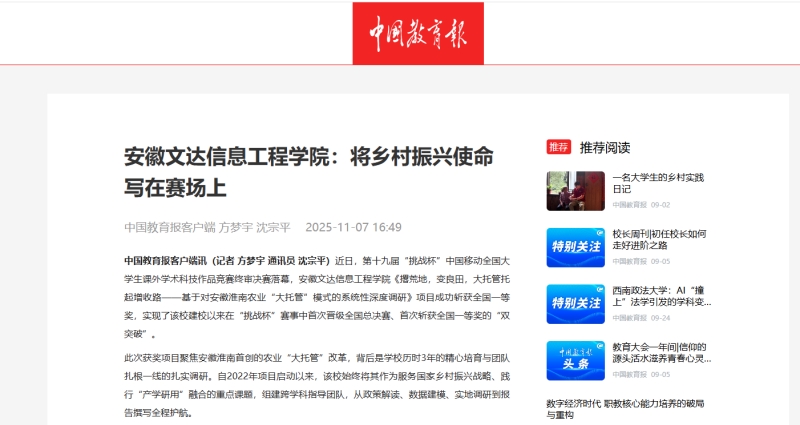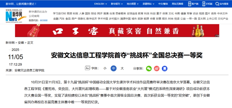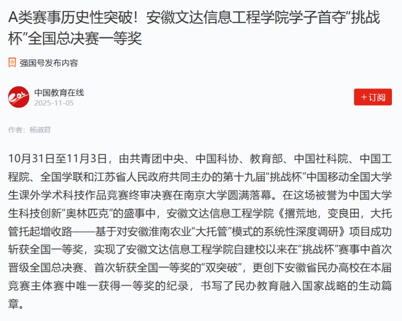 10月31日至11月3日,第十九届“挑战杯”中国移动全国大学生课外学术科技作品竞赛终审决赛在南京大学落幕,我校凭借《撂荒地,变良田,大托管托起增收路——基于对安徽淮南农业“大托管”模式的系统性深度调研》项目斩获全国一等奖,实现该校“挑战杯”赛事“首次晋级全国总决赛、首次获全国一等奖”的“双突破”,更创下安徽省民办高校在本届竞赛主体赛中唯一一等奖的纪录。中国教育报、新华网、中国教育在线、中国教育新闻网、学习强国、安徽日报、安徽教育网等多家媒体均进行了报道,深度解读学校以赛促学的育人路径与实践成效。