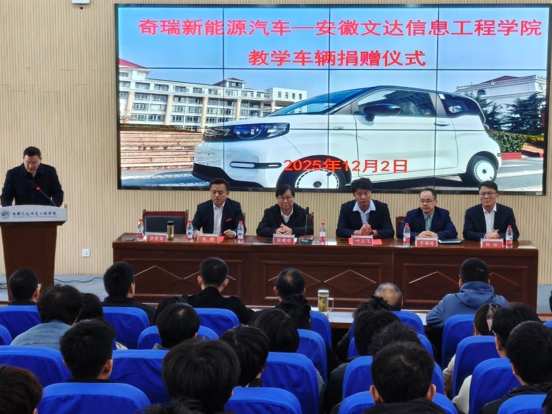 12月2日,奇瑞新能源汽车股份有限公司向我校捐赠教学车辆仪式在文鼎楼多功能厅举行。常务副校长张穗萌、教务处处长李琚陈、实验实训与固定资产管理处处长吴刚,智能制造学院党总支书记、执行院长刘松,奇瑞新能源人事经理叶云飞出席仪式,智能制造学院新能源汽车专业师生代表参加仪式。智能制造学院院长张家玺主持仪式。