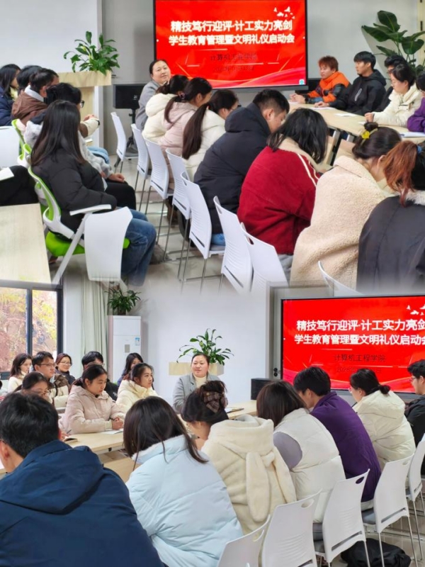 为扎实推进学生教育管理工作提质增效,全面开展文明礼仪教育活动,以良好风貌迎接评估工作,12月12日,计算机工程学院召开以“精技笃行迎评·计工实力亮剑”为主题的学生教育管理暨文明礼仪启动会。党总支副书记、副院长袁学华,团总支书记张乃文,全体辅导员及学生干部、学生党员、班团骨干代表参会。