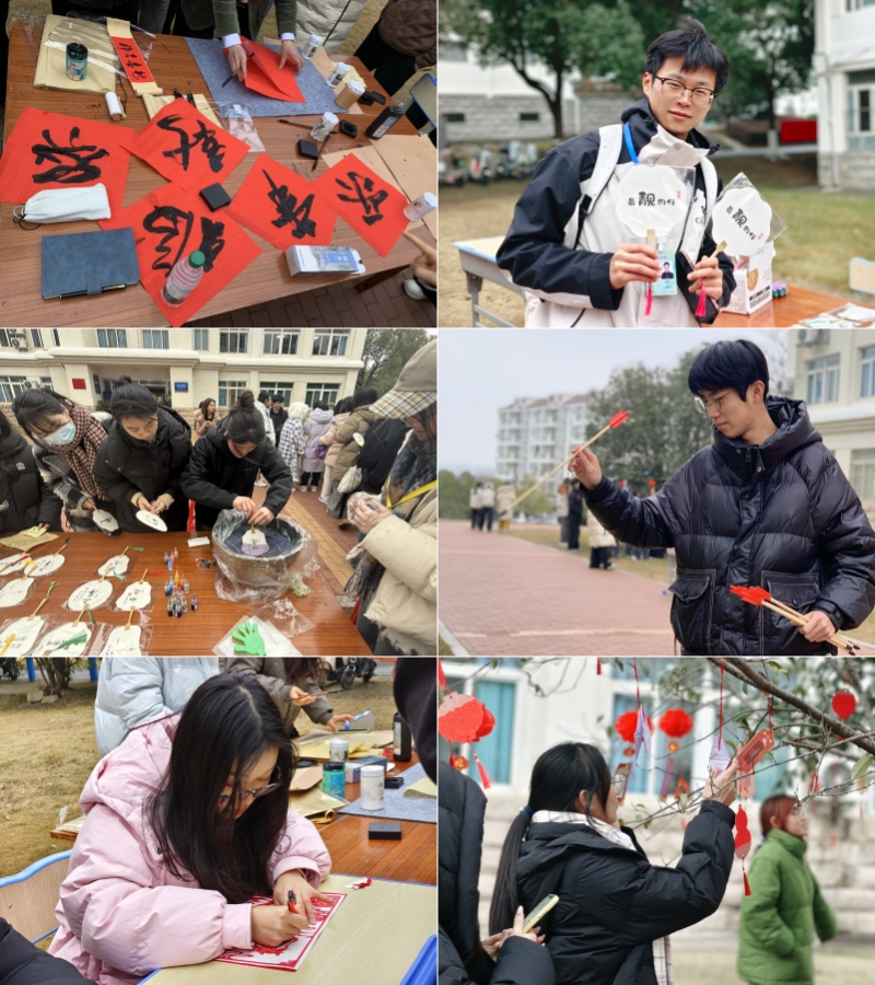 “共织华夏韵,民族欢乐荟”活动在振宁楼与稼先楼之间开展。活动现场设置了猜灯谜、剪窗花、投壶、书法创作等多个传统文化体验区,学生穿梭其间,踊跃参与。猜灯谜区域悬挂着精心制作的谜题卡片,同学们驻足思考、交流答案;剪窗花区域大家巧手翻飞,创作出各式吉祥图案;投壶区更是欢声不断,同学们在传统游戏中感受礼乐风采。活动特别设置了“漆扇制作”奖励环节,激励同学们在各项活动中积极表现,共有30名同学通过优异表现获得了亲手制作漆扇的机会,进一步增强了活动的趣味性与参与感。