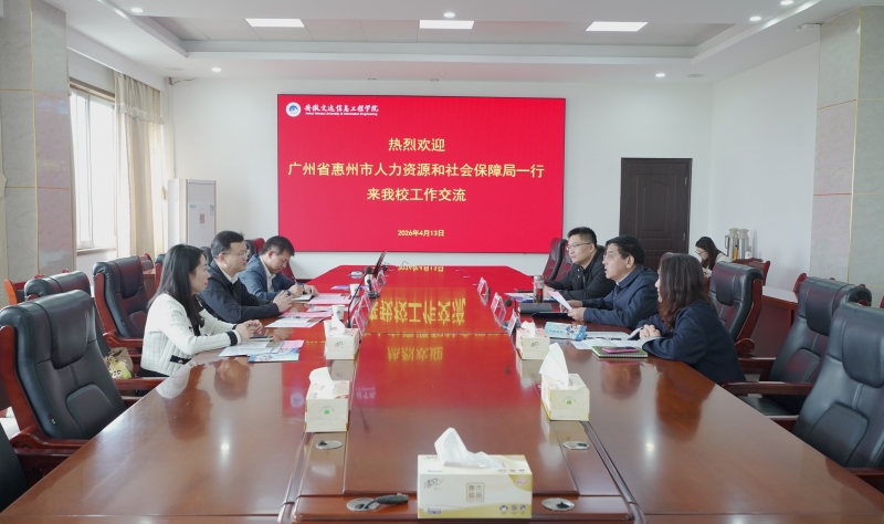 4月13日,惠州市人力资源和社会保障局党组书记、局长吴嘉明,惠州市人才中心副主任夏海滨来校开展就业工作交流会。学校副校长袁文龙,招生就业处处长赵冉、副处长程永政等参加会议。双方就“百万英才汇南粤”招聘活动开展洽谈交流。