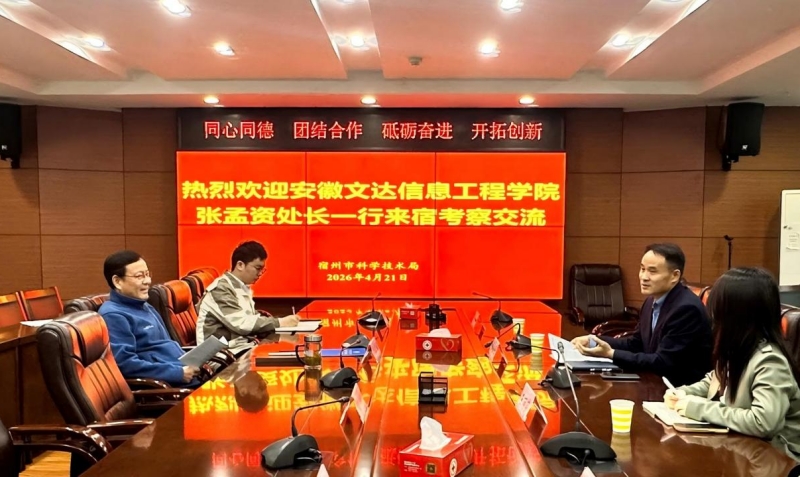 在宿州市科学技术局,四级调研员、成果转化与技术转移办公室主任杨夫杰,介绍了宿州市科创企业发展方向、科研人才需求及政校企合作路径。张孟资介绍了我校科研平台、科研团队及成果获奖情况。双方围绕科研项目申报、成果转化、人才培养等议题展开深入交流,并就下一步推进校企合作达成共识。