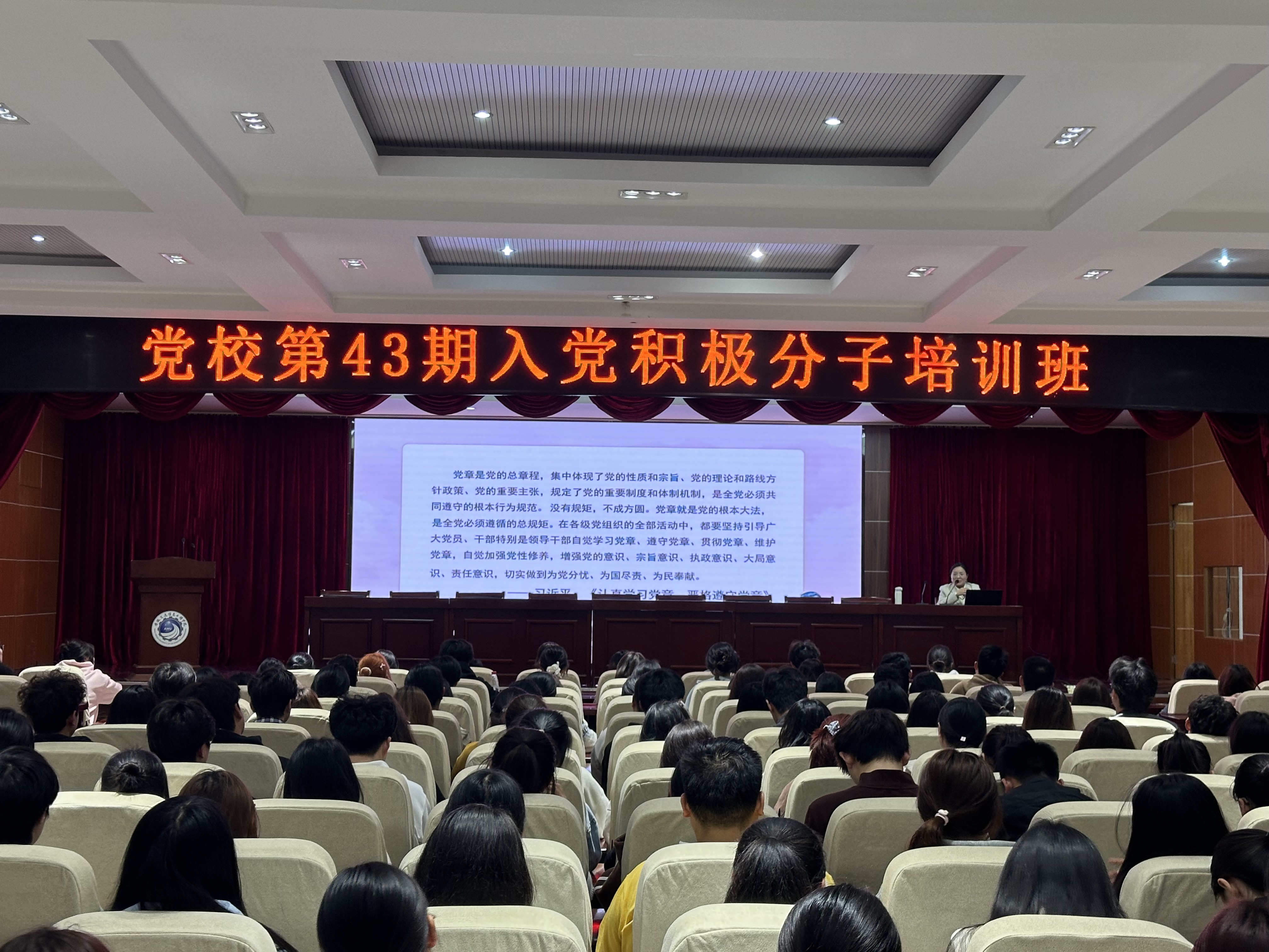 4月8日下午,党校第43期入党积极分子培训班在图书馆五楼学术报告厅正式开班。首次集中授课围绕《中国共产党章程》专题解读展开,标志着本期为期两周的系统培训全面启动。
