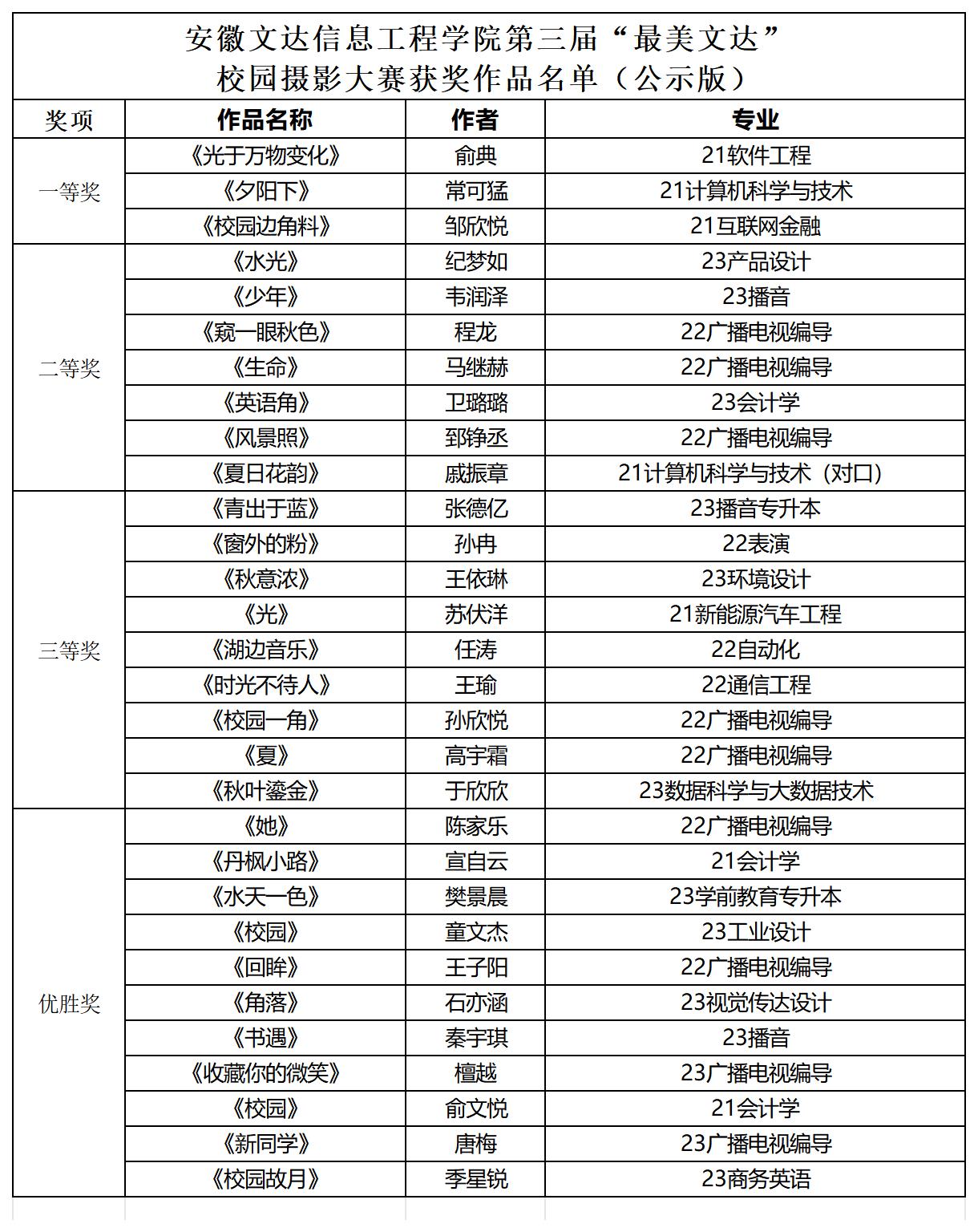 关于安徽文达信息工程学院第三届“最美文达”校园摄影大赛评审结果的公示