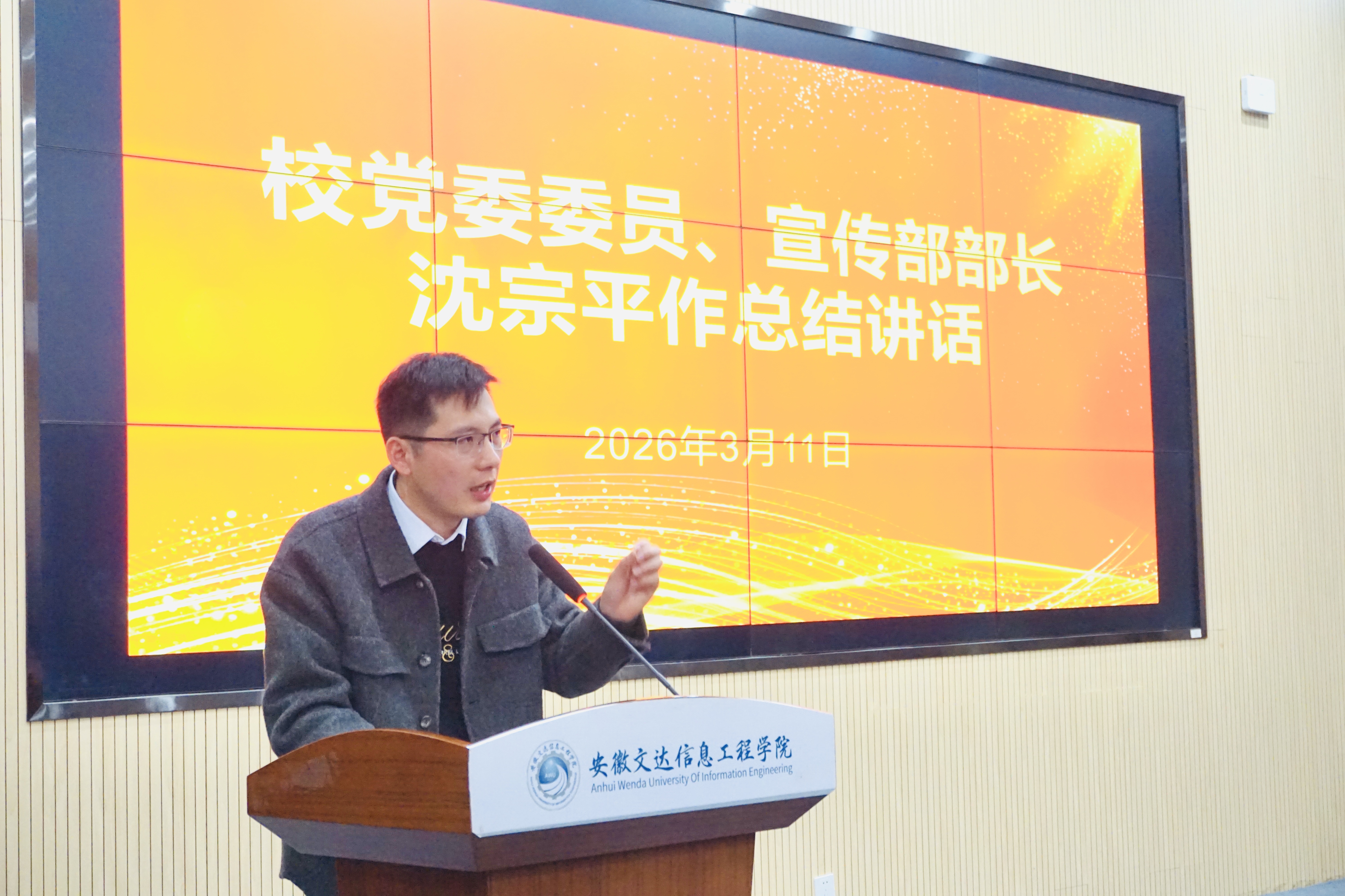 沈宗平代表学校党委宣传部作总结讲话。他对融媒体中心过去一学年取得的成绩表示充分肯定,对全体成员的辛勤付出表示衷心感谢。他指出,过去一学年,从广播部每天的准时播音,到各平台的持续更新;从一条条刷屏文达朋友圈的爆款推文,到一次次被省级媒体平台转载的作品——这些成绩的取得,是同学们用热爱和专业堆出来的。他强调,新学期全体成员要学会向工具要效率,善用AI平台辅助内容创作;要把“融”字真正做实,打破部门壁垒,强化协同联动;心里要装得下整个团队,从“我”变成“我们”;要用作品说话、用实绩交卷,争取更多作品被省级以上平台转载。他最后寄语全体同学,用好手中的笔、镜头和话筒,做出更多有温度、有深度、有传播力的作品。