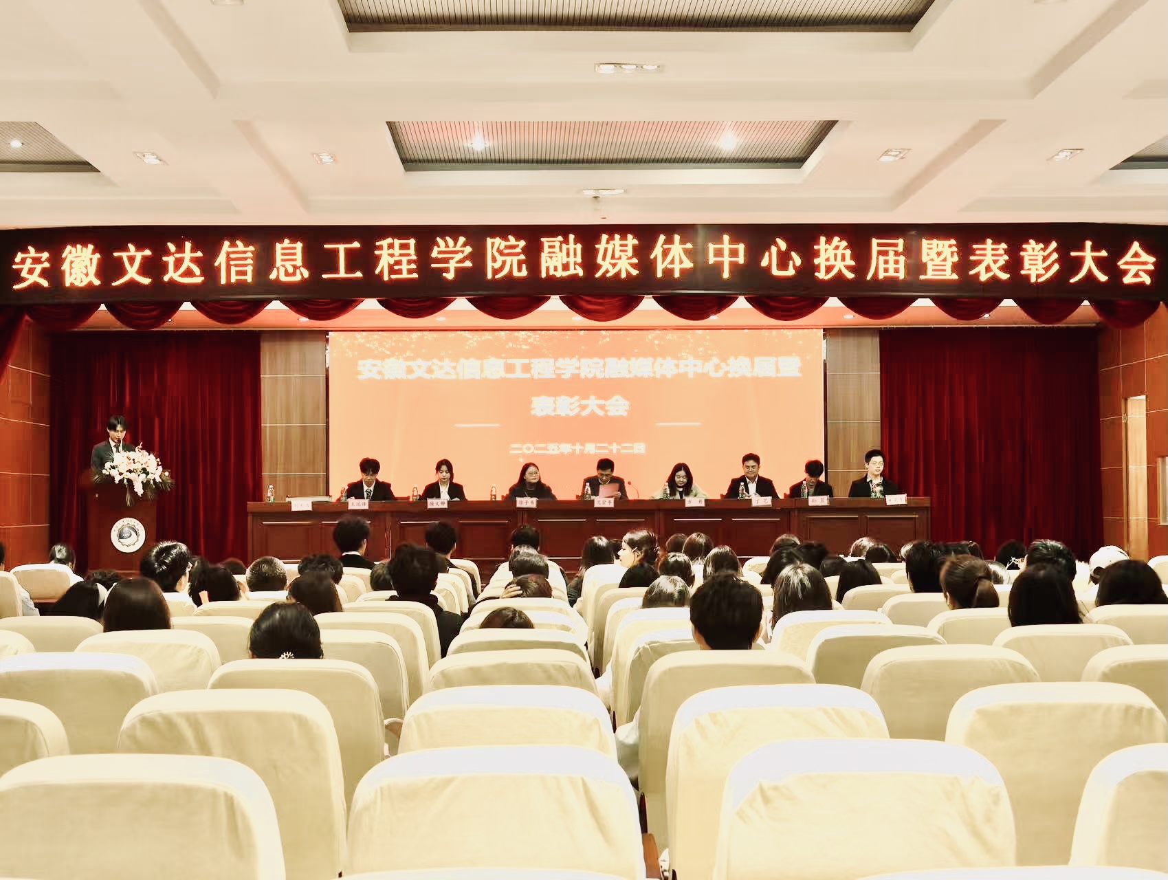 10月22日,我校融媒体中心换届暨表彰大会在图书馆五楼学术报告厅举行。校党委委员、党委宣传部部长沈宗平,融媒体中心指导教师方丹、徐子韦,第五届融媒体中心学生干部及部员,第六届融媒体中心全体成员参加会议。会议由第六届融媒体中心副主任刘天浩主持。