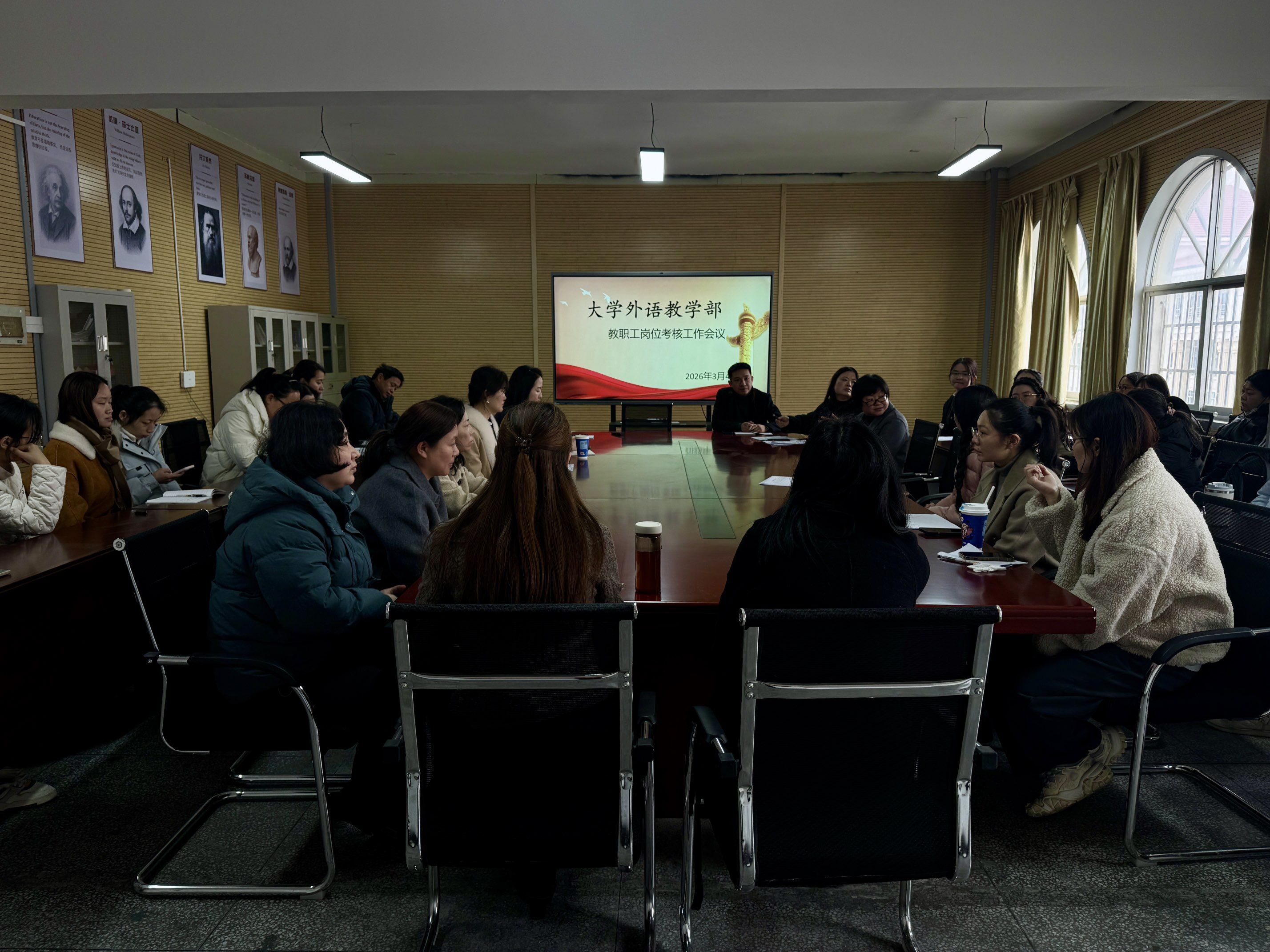 为落实学校年度考核部署,规范履职评价、激发队伍活力,2026年3月4日,大学外语教学部召开教职工岗位考核工作会议,全体教职工参会。