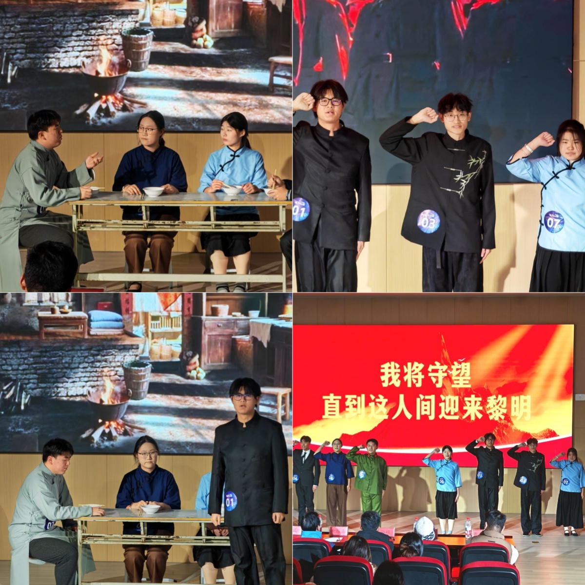 本次参赛话剧以深厚的爱国情怀为主线,生动再现了九一八事变后的烽火岁月:起初,亲历战争残酷的老师担忧学子安危,不赞同他们投身抗争;而满怀热血的学子们,受《国殇》中楚军将士忠贞报国、勇武赴死的精神深刻感召,坚定了反抗侵略的决心,最终毅然参军守护家国。演出中,学子们以精湛的演技、真挚的情感与富有张力的肢体语言,将先辈的理想信念与当代青年的使命担当鲜活呈现,让现场观众沉浸式感受红色基因的传承魅力,深刻体悟爱国精神的时代力量。演出尾声的庄严宣誓,更彰显了新时代青年的责任担当,极大激发了全院学子的爱国奋斗豪情。