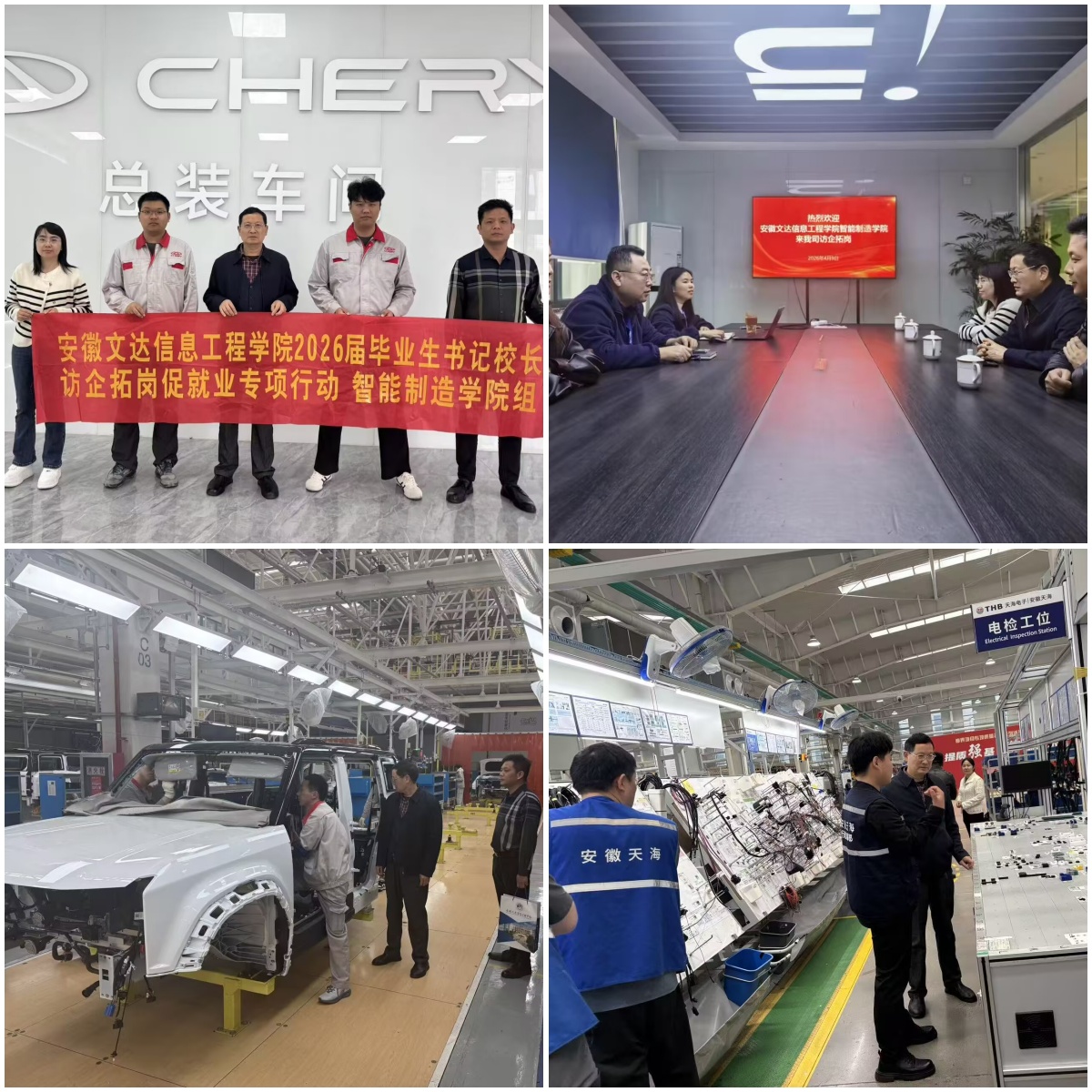 为深化产教融合、校企协同育人,精准对接企业人才需求,拓宽毕业生就业渠道,4月9日至10日,智能制造学院院长张家玺、副院长鲍龙星及学生第一党支部书记汪琴一行,先后走访安徽天海电子有限公司、芜湖安瑞光电有限公司、芜湖奇瑞新能源股份有限公司,并与各企业人事负责人召开专题座谈会。