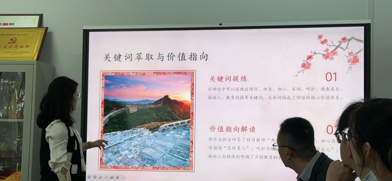 分享会上,虚拟现实技术教研室周主任总结道:“作为教育工作者,我们要立足自身岗位,培养学生的道德情操和创新能力,为实现中华民族的伟大复兴贡献力量。”他呼吁全体师生共同努力,将“尺素传情”的理念落实到日常教学中,通过实际行动践行“立德树人”的根本任务。(图文/周晓成 审核/李银萍)