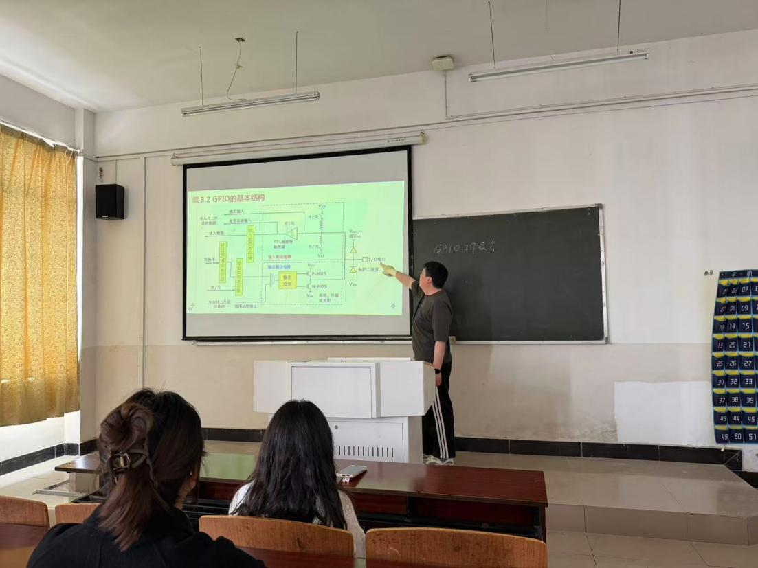 听课环节中,授课教师以“GPIO的基本结构”为主题,系统讲解GPIO端口结构、工作模式、配置方法及实际应用场景,将理论讲解与实验操作有机结合,结合GPIO控制LED、按键等实操案例,灵活运用启发式教学、案例教学等方法,引导学生主动思考、动手实践,充分调动了学生的学习积极性和主动性。