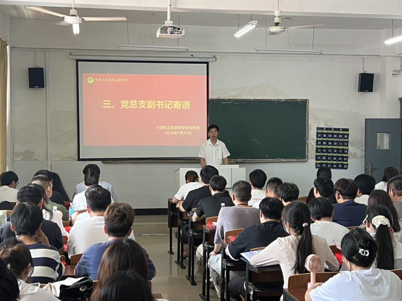 为进一步加强、落实毕业生党员教育,激励全体毕业生党员同志坚定信念,以饱满的青春热情、良好的精神风貌踏入人生新征程。6月16日,计算机工程学院学生党支部在庄子301教室组织开展2024届毕业生党员最后一课。本次党课由党总支副书记朱伟主讲,学生第四党支部书记骆攀攀主持,全体毕业生党员参加。