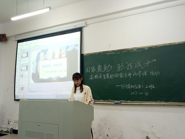 为激励我校普通高等教育学生勤奋学习,努力进取,在德智体美等方面全面发展,16级计算机应用1、2班于2017年10月23日(周一)晚6:30在庄子楼301举办了以“国家资助,助我成才”的主题班会。此次班会由应用1班班长甘露和应用2班学习委员胡希望共同主持,以PPT 的形式带领两个班的学生一起共同学习“安徽文达信息工程学院学生资助和奖学金评审政策”,让大家更加进一步的了解相关政策,鼓励大家积极进取,激发大家的学习斗志。