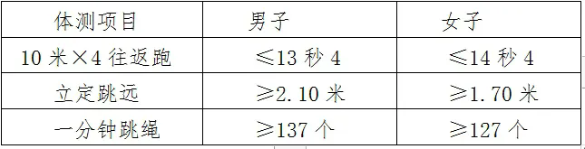 2、体能测评参考《关于印发<公安机关录用人民警察体能测评项目和标准>的通知》(公政治〔2024〕60号)规定执行,结合公安工作实际需要,体能测评内容为10米×4往返跑、立定跳远、一分钟跳绳(体能测评采取通过式、单项测评次数不超过两次),以上体能测评项目采取“三选二”的模式,由考生自主选择,具体合格标准如下: