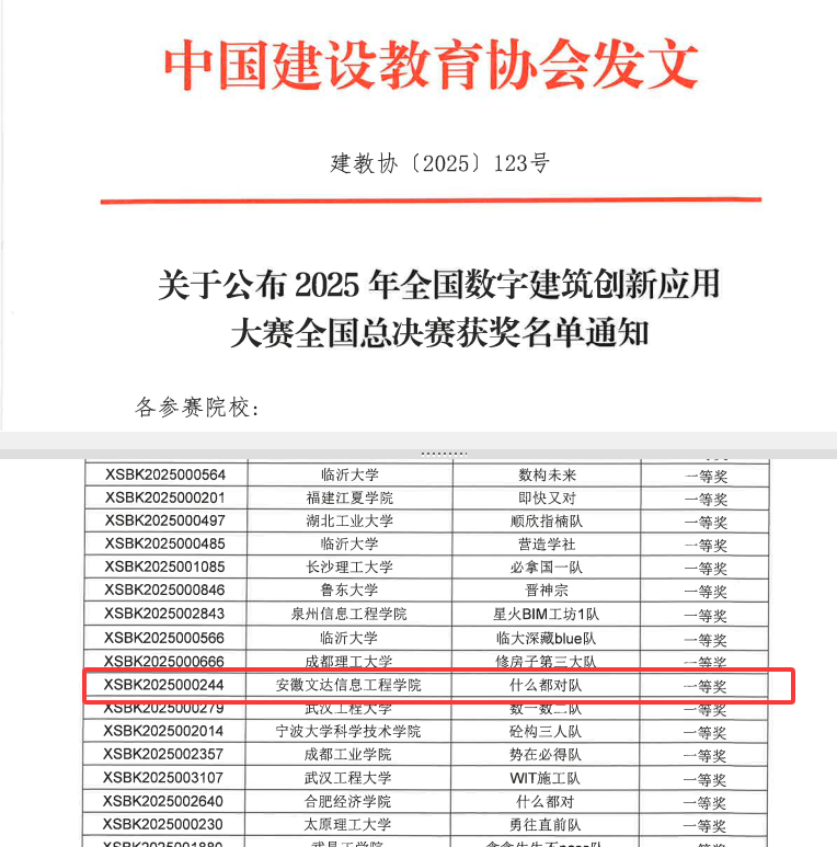 近日,城市建设学院两支代表队参加“2025年全国数字建筑创新应用大赛全国总决赛”,最终斩获全国总决赛一等奖 1 项、三等奖 1 项。