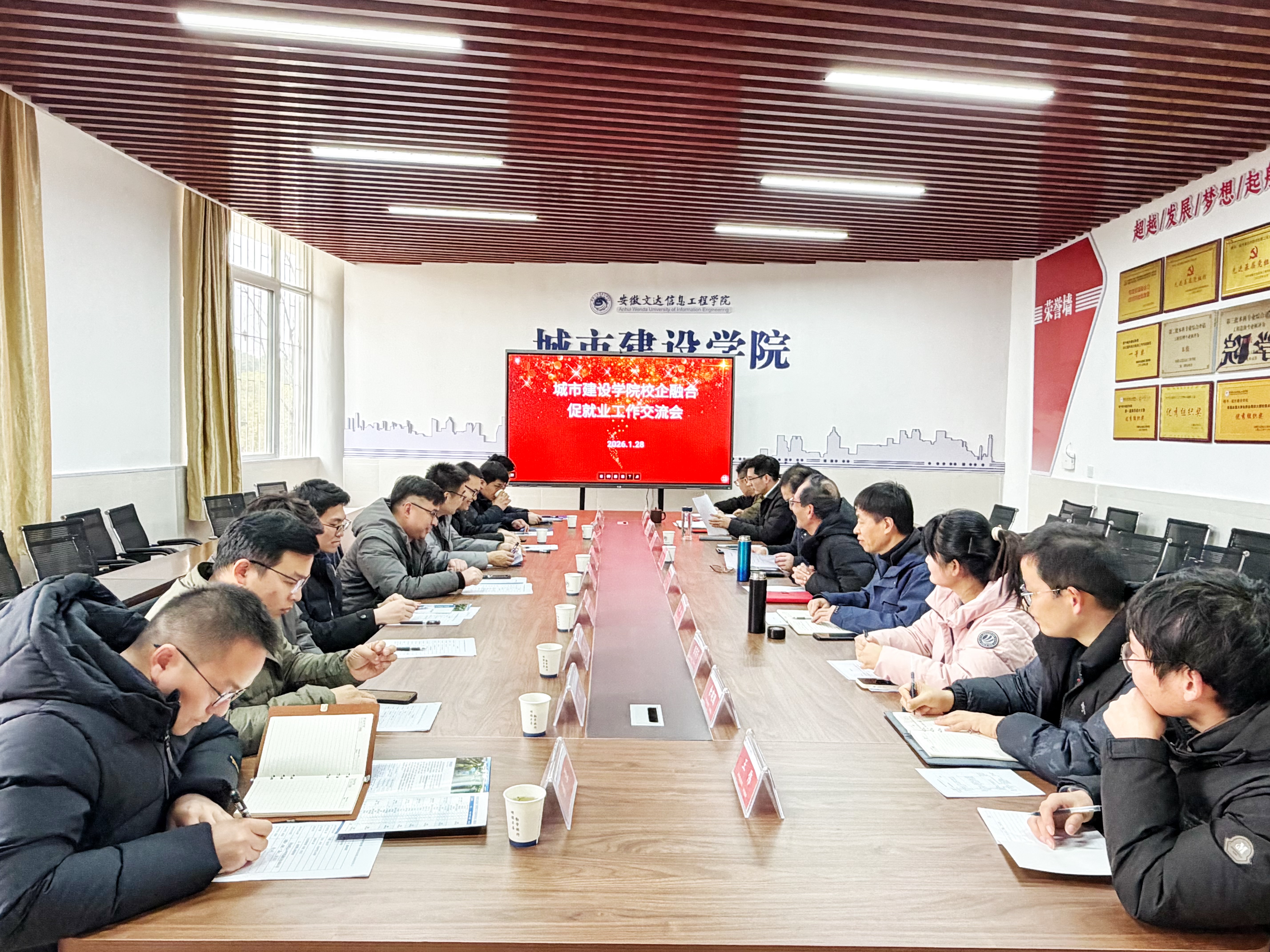 1月28日下午,城市建设学院召开校企融合促就业工作交流会,华润置地(合肥)有限公司等9家企业负责人受邀到校参加座谈。副校长张东旭出席会议并讲话,招生就业处处长刘宏、学院班子成员及各教研室主任参会,院长孙强主持会议。
