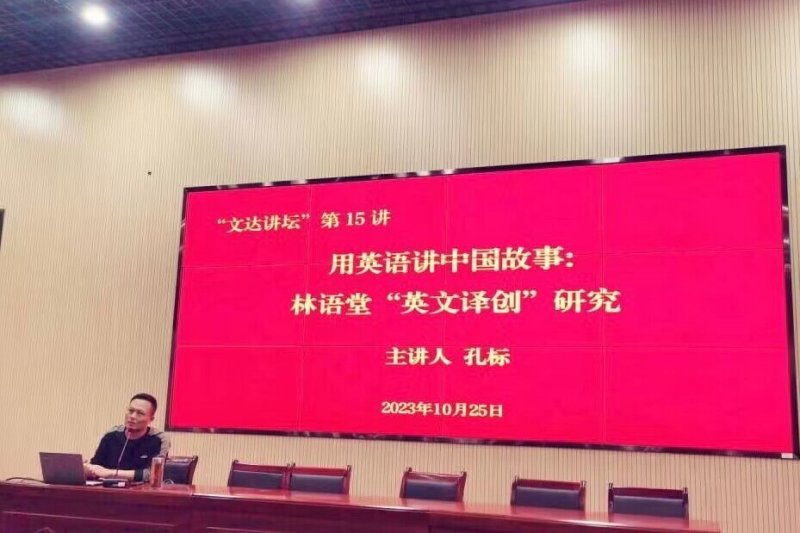 为加强中华优秀传统文化教育,讲好中国故事,传播好中国声音,坚定文化自信。10月25日下午,我校“文达讲坛”第十五讲在文鼎楼三楼多功能厅开讲。本次讲坛以“用英语讲中国故事:林语堂‘英文译创’研究”为题,由大学外语教学部主任孔标主讲。