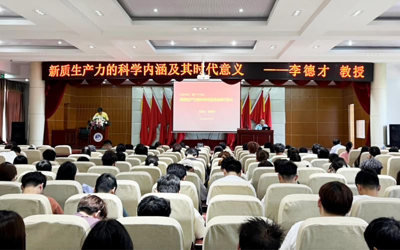 为增强我校师生学术科研意识,提升我校学术科研氛围和科研水平,5月15日下午,我校在图书馆五楼学术报告厅举办了“文达讲坛”系列讲座活动的第二十九场讲座。由马克思主义学院李德才教授主讲《新质生产力的科学内涵及其时代意义》。350余名师生现场聆听了本次讲座。讲座由马克思主义学院院长助理孙硕主持。