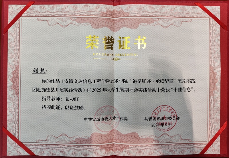 近日,在中共宣城市委人才工作局、共青团宣城市委员会联合开展的“校地携手 智汇宣城”大学生社会实践活动中,艺术学院2025年“追循红迹·承续华章”暑期三下乡实践团,荣获宣城市暑期社会实践“十佳信息”奖。这一奖项不仅是对实践团成员辛勤付出的高度肯定,也是我院实践育人工作成效的生动体现。