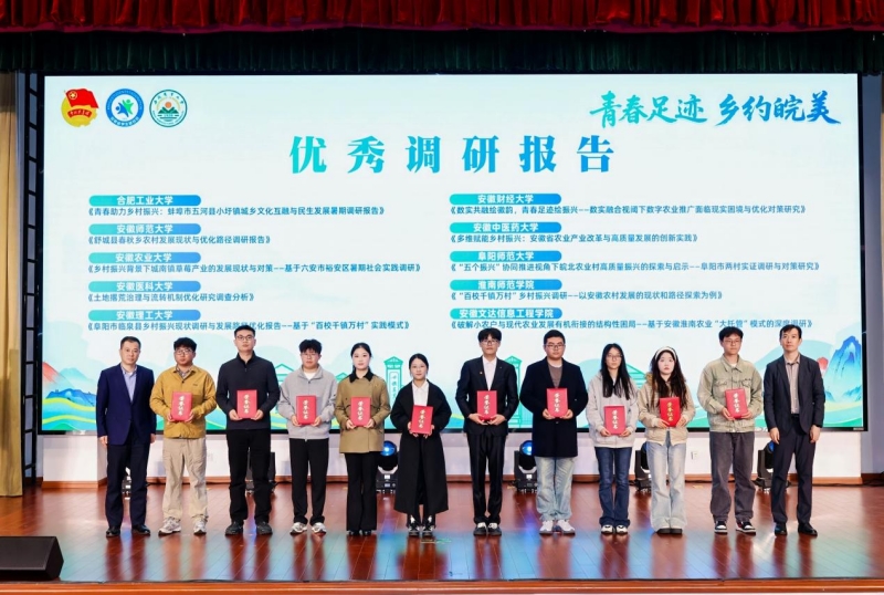 10月24日,安徽省“百校千镇万村”大学生乡村振兴大调研总结大会在安徽农业大学隆重举行。会计学院“青耘沃野·乡兴有我”暑期社会实践团获得安徽省大调研专项优秀团队,其撰写的调查报告获得安徽省大调研专项“优秀调查报告”,团队负责人黄岩翔获得优秀实践个人称号。