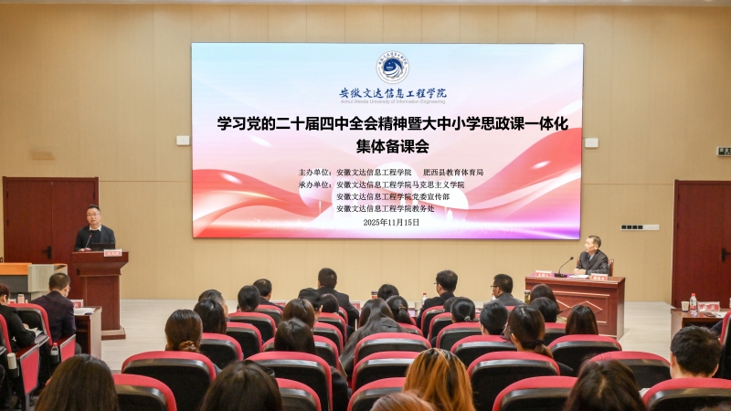 11月15日,学习党的二十届四中全会精神暨大中小学思政课一体化集体备课会在安徽文达信息工程学院举行。活动由安徽文达信息工程学院与肥西县教育体育局联合主办,学校党委副书记、副校长、纪委书记唐立军,肥西县教育体育局督学梁玉虎,合肥市教育科学研究院正高级研究员侯新旺,安徽外国语学院马克思主义学院院长王有炜,徽商职业技术学院马克思主义学院副院长张林,合肥市南门小学党委副书记、校长何炜及多所高校、教育主管部门及肥西县大中小学的专家、一线思政教师齐聚,共商思政育人路径,推进区域思政课一体化建设。