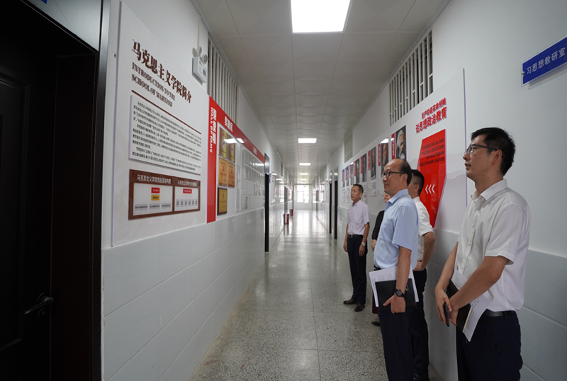 调研伊始,校领导一行首先参观了马克思主义学院文化墙。新落成的马克思主义学院文化墙涵盖六大板块:无产阶级革命领袖论思想政治教育、中国共产党辉煌历程、马克思主义学院简介、思政课建设成果、荣誉展示墙及教师风采栏。文化墙全面展现了马克思主义学院在党建引领、理论研究、教学建设与队伍发展等方面的扎实基础与鲜明特色。校领导对文化墙所营造的浓厚思想政治教育文化氛围给予充分肯定。