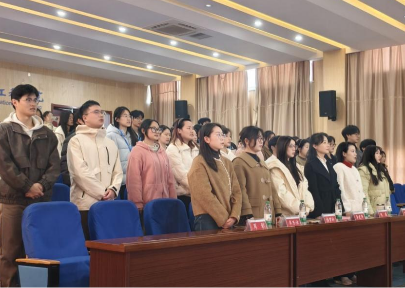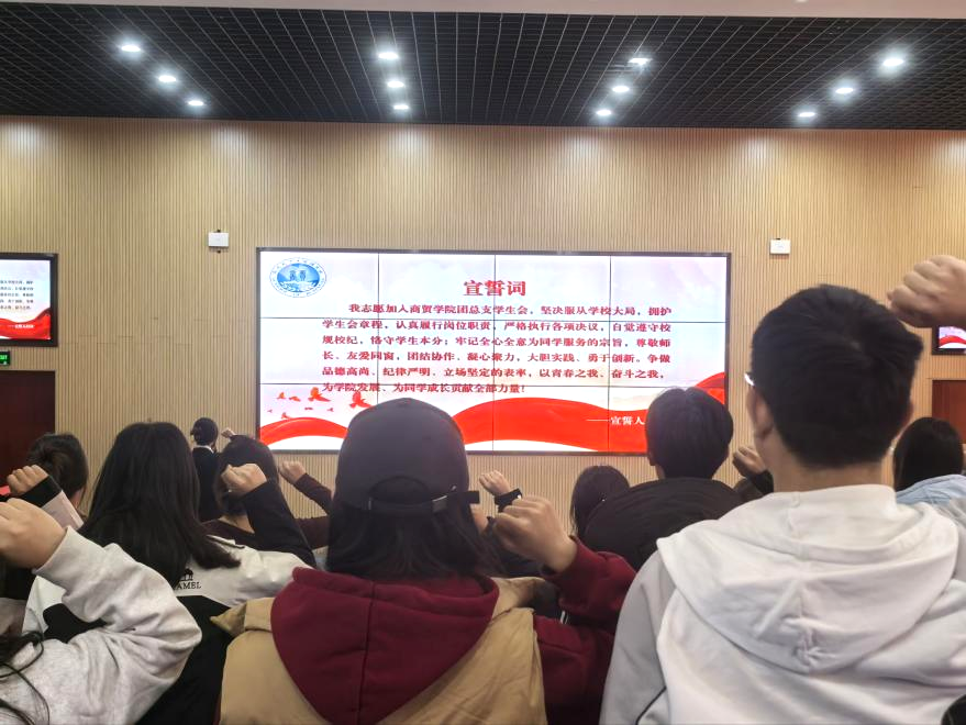 紧接着,在胡陈晨的带领下,新一届学生会成员全体起立宣誓。“我志愿加入商贸学院团总支学生会…… 牢记全心全意为同学服务的宗旨,尊敬师长、友爱同窗,团结协作、凝心聚力……”铿锵有力的誓言响彻会场,既是全体成员对工作的郑重承诺,也是对学院的深情告白,展现了他们投身学生工作、助力学院发展的坚定决心。