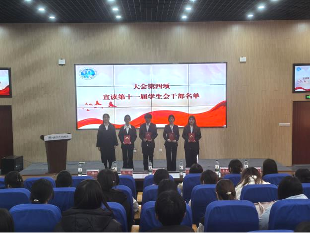 表彰过后,大会迎来核心环节——新一届学生会干部任命。胡陈晨郑重宣布新一届学生会干部名单,涵盖主席团及各部门负责人。李爱萍、桂梦玲共同为新一届干部颁发任职证书,开启商贸学院学生会工作的新篇章。