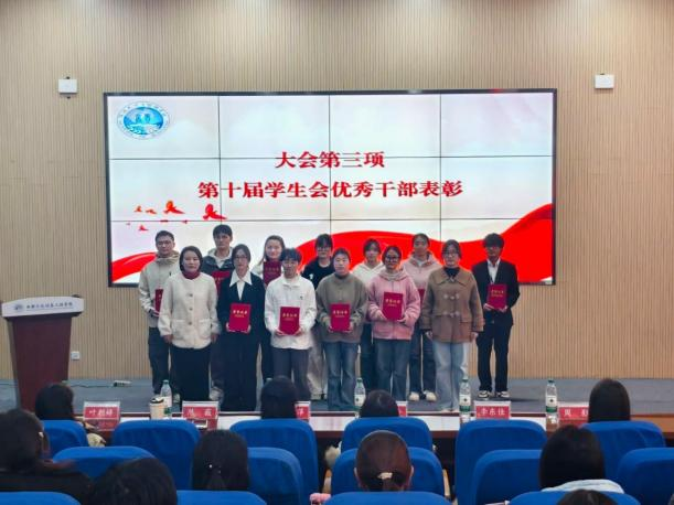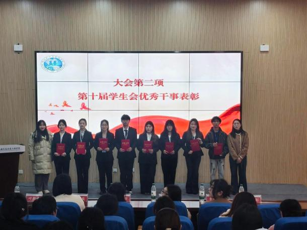 国歌声毕,大会进入表彰环节。首先,第十届学生会执行主席胡陈晨上台宣读优秀干事、优秀干部名单,获奖成员依次登台,接受老师们颁发的荣誉证书。一张张证书不仅是对他们过去一年在学生工作中勤恳付出、积极奉献的肯定,更是对他们责任意识与服务精神的嘉奖。