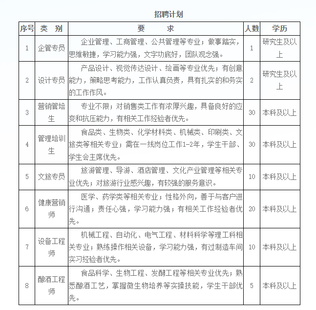 员工福利:社会保险、住房公积金、带薪休假、高温津贴、免费体检、员工旅游、节假日福利、技能培训、定制工作服、购酒/购房优惠、宿舍(单人宿舍/标准间/家庭房)、发放特色的过节慰问品