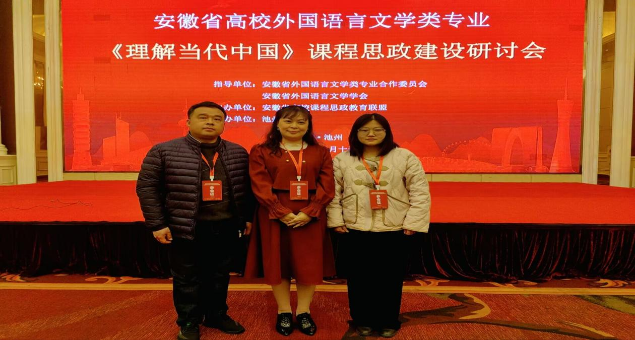 为深入推进课程思政教学工作,商贸学院组织商务英语教研室胡雯雯、李艳、李传等三位老师参加了由安徽省高校课程思政教育联盟主办,池州学院承办的“安徽省外国语言文学类专业《理解当代中国》课程思政建设研讨会”,即“三进”课程教学研讨会。会议于3月11-12日在池州举办,研讨会中北京外国语大学林岩教授、上海交通大学李梁教授、安徽大学詹全旺教授、安徽师范大学张孝荣教授、淮南师范学院方秀才教授、池州学院宋婷博士、安庆师范大学陈水生博士等专家学者分别作了主旨报告。其中,林岩教授的主题为“《理解当代中国:英语演讲教程》教学设计与实践”,李梁教授的主题是“抓好课程思政建设,解决好专业思政与思政教育‘两张皮’的理论思考”。其余省内专家的发言也均与“三进”工作密切相关。与会专家们的精彩报告让我院三位参会老师深受启发,获益匪浅。