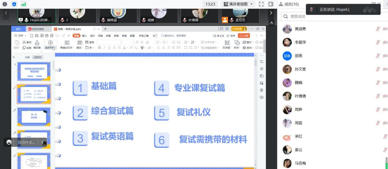 李艳从研究生复试、调剂流程、注意事项及常见问题等方面进行了详细解读,并就调剂院校和专业选择、专业课复试、综合面试及英语口语复试、复试礼仪等问题跟同学们进行了交流,提醒学生要在基本功上下功夫,鼓励学生要调整心态、积极备战。