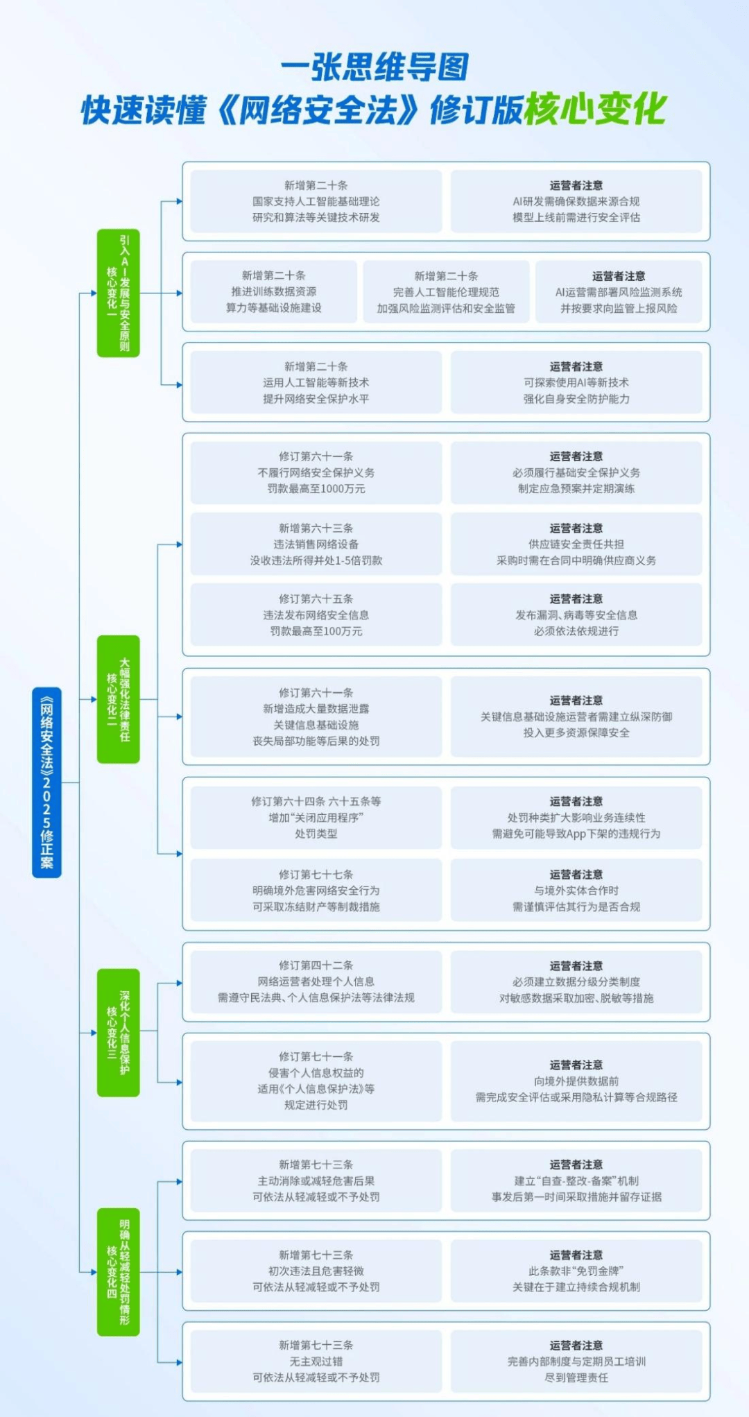 本次《网络安全法》的修改,对于网络安全运营者而言,需要关注的核心变化主要体现在:引入AI发展与安全原则、大幅强化法律责任、深化个人信息保护以及明确从轻减轻处罚的情形。