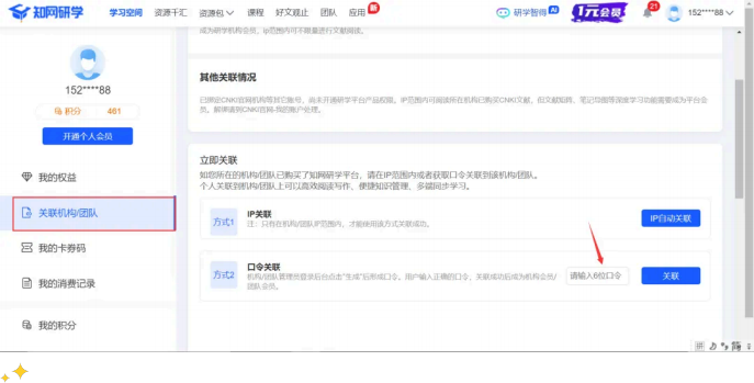 2.点击左侧“ 关联机构/团队 ” ,选择口令关联 ,输入6位口令( Q7RFD6) ,点击“ 关联 ”(请勿使用IP 绑定)。
