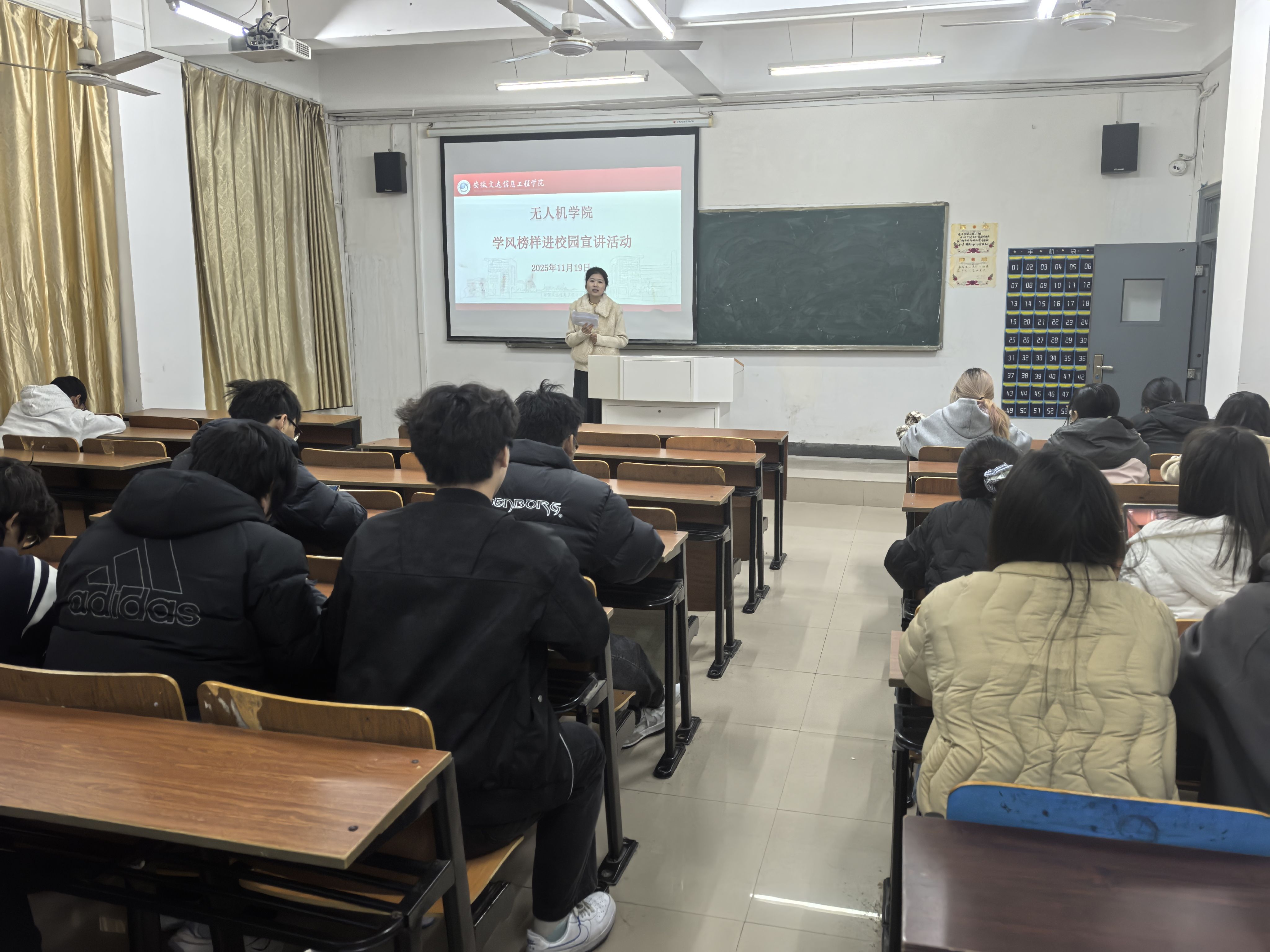 为充分发挥优秀学生的示范引领作用,营造勤学善思、笃行实干的优良学风,助力学校审核评估工作走深走实,11月19日晚6点30分,无人机学院“学风榜样进校园”宣讲活动在25级各班级晚自习教室顺利举行。校奖学金获得者代表受邀分享学习经验,与同学们面对面交流成长心得。