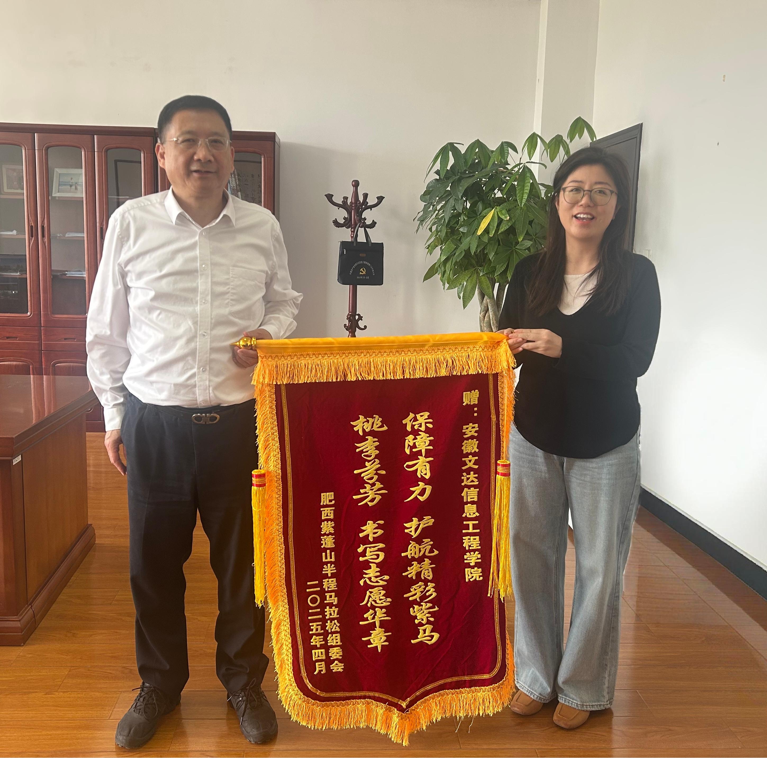 4月12日上午,肥西紫蓬山半程马拉松赛在肥西县紫蓬山欢乐开跑,吸引了6000余名跑友参赛。本次马拉松比赛由肥西县政府主办,作为承担本次赛事志愿服务工作的高校,我校安排640名文达青年志愿者参与起终点记时、秩序维护、物资补给、赛道氛围、赛后拉伸、礼仪颁奖等志愿服务工作,以专业的服务、热忱的态度、坚韧的守护,为赛事保驾护航,展现了我校青年良好的精神风貌和青春风采,助力肥西“半马”成功举办。团县委书记李然特别代表主办方来校表示谢意,党委副书记、校长熊健接受感谢锦旗。