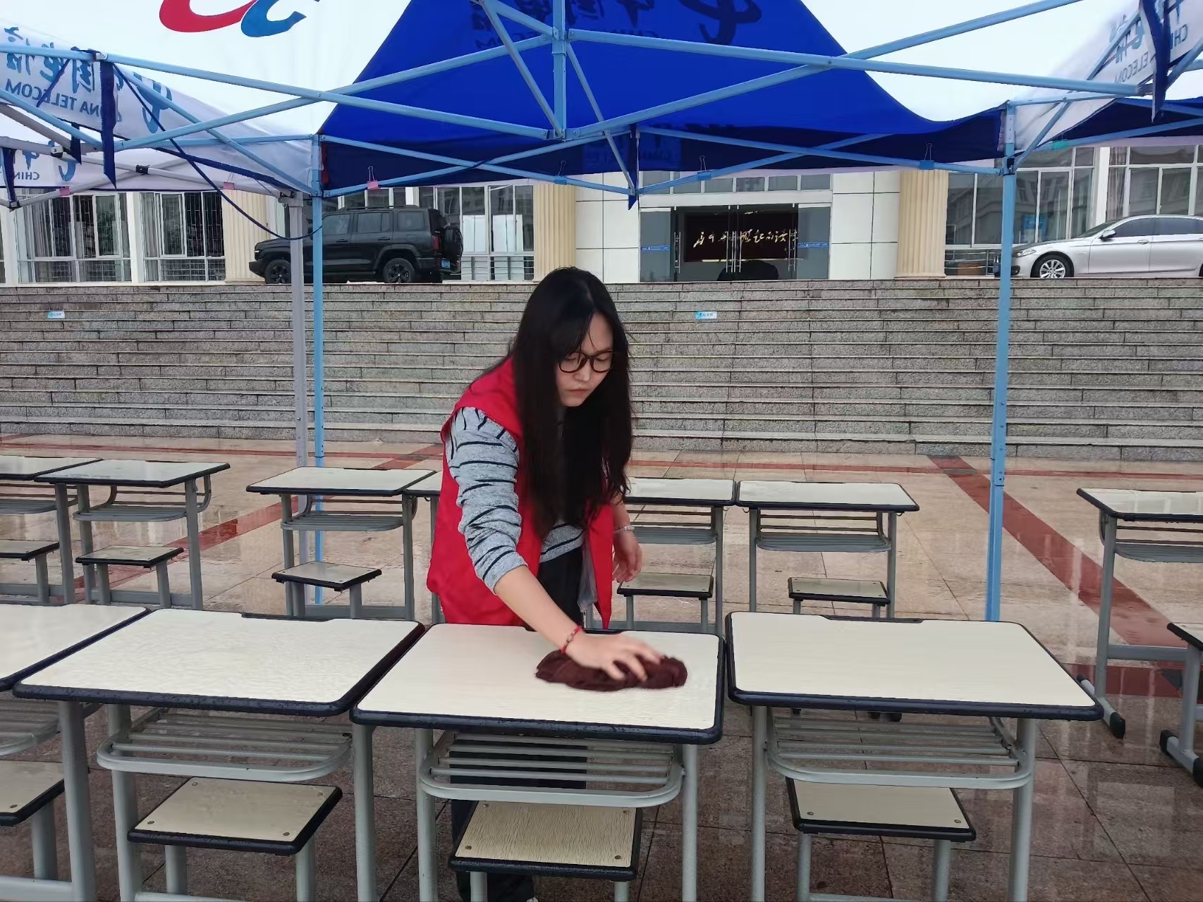 为快速恢复场地原貌,也为了给此次雨中的双选会画上整洁圆满的句号,志愿者们不顾地面湿滑,迅速集结、齐心协力投入收尾工作。他们在雨中有序整理散落的桌椅并归位,细致清理场地内被雨水打湿的宣传页、矿泉水瓶等垃圾,还协助工作人员在湿滑环境下清点回收物资。每一个在雨中认真的动作,都彰显着志愿服务在恶劣环境下的责任与担当。