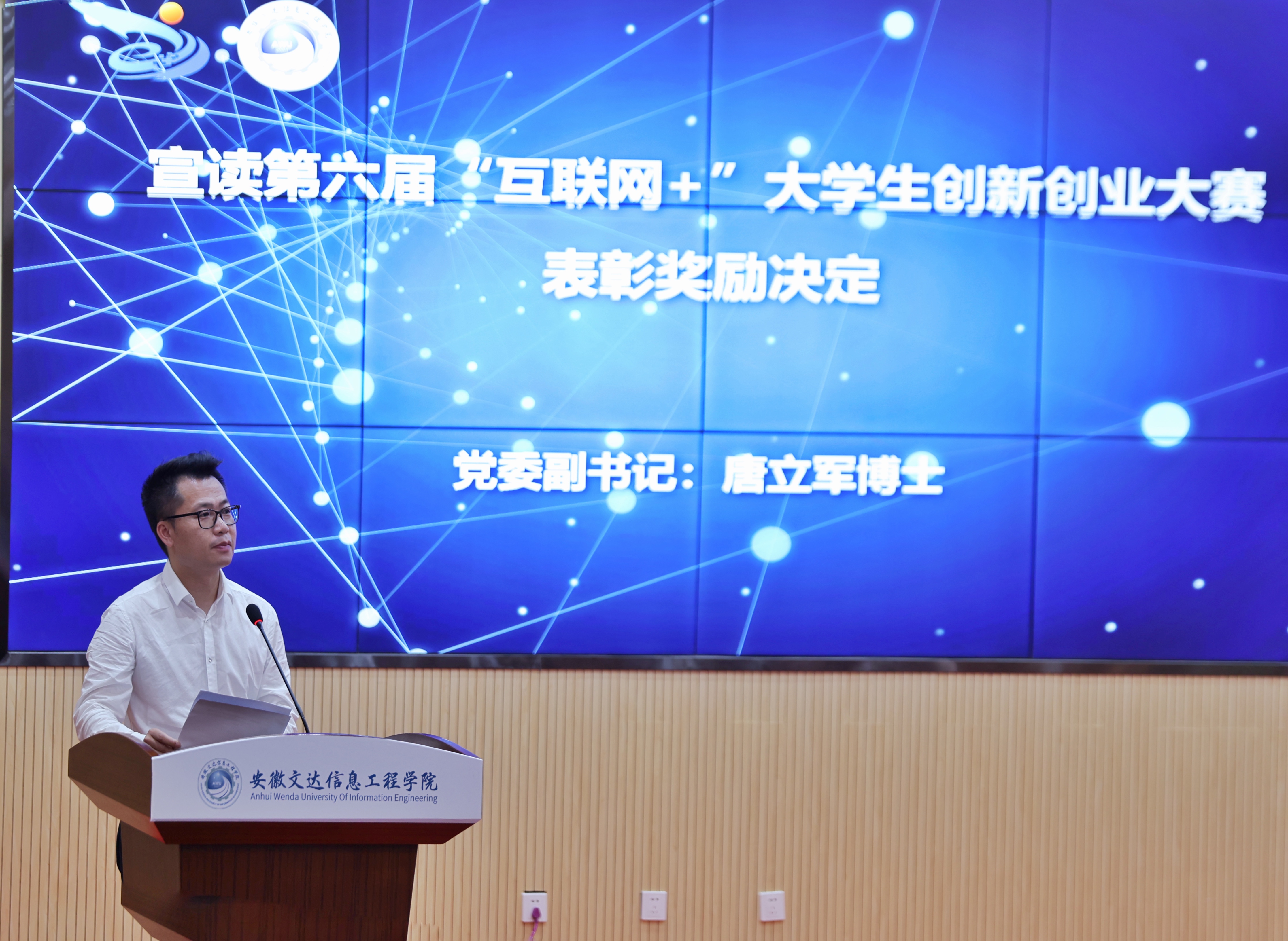 党委副书记唐立军宣读“关于表彰奖励第六届“互联网+“大学生创新创业大赛获奖团队、优秀指导教师及优秀组织单位的决定”并颁奖。随后,校领导给各获奖团队及优秀指导教师颁奖并合影留念。
