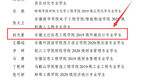 5月4日,共青团安徽省委下发关于表彰安徽省五四红旗团委(团支部)、安徽省优秀共青团员、安徽省优秀共青团干部的决定,安徽文达信息工程学院团委首次荣获“安徽省五四红旗团委”称号,我校2019级环境设计专业学生赵允豪荣获“安徽省优秀共青团员”称号。据悉,上述荣誉称号是团省委授予团组织、个人的最高荣誉。