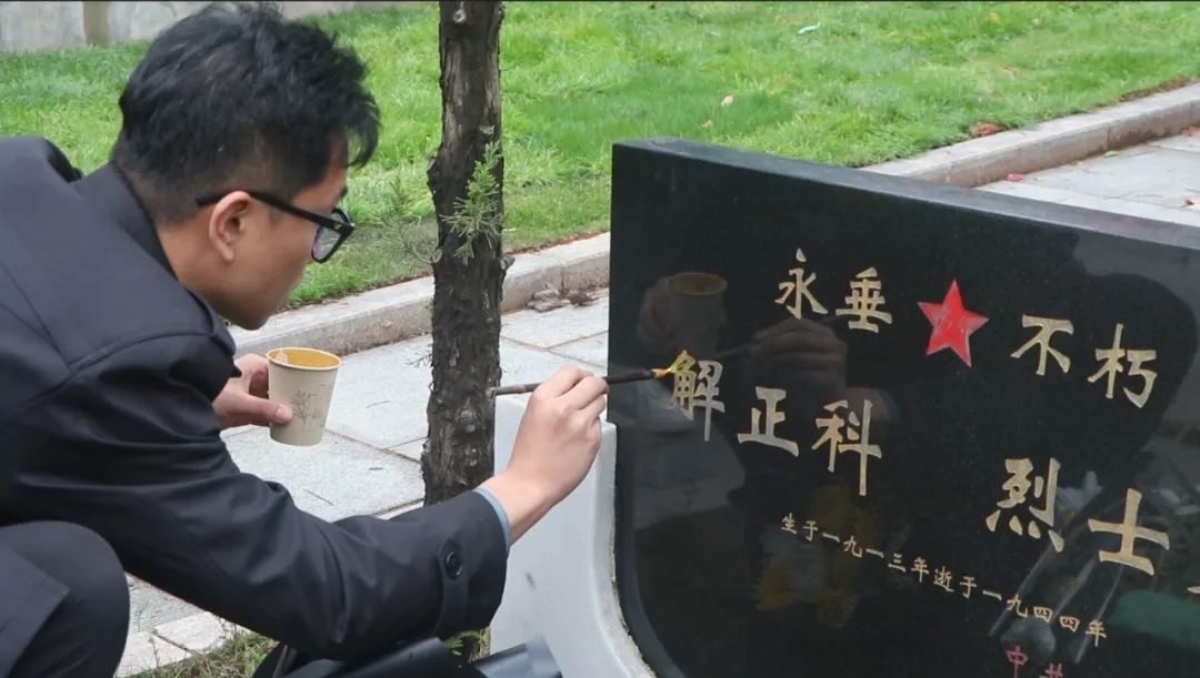 在烈士墓园里,团员青年们对烈士的墓碑进行打扫,描金。这一庄严肃穆的活动让每一位共青团员心中都涌起无限感慨:“我怕下笔太重,惊扰烈士英魂,又怕下笔太轻,描不出他们惊天动地的往昔。”