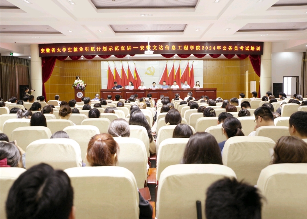 为深入学习宣传贯彻习近平新时代中国特色社会主义思想,全面贯彻落实党的二十大精神,做好高校毕业生就业工作。9月20日下午,安徽省大学生就业引航计划示范宣讲—高质量就业解读专场暨安徽文达信息工程学院2024年公务员考试培训在我校图书馆五楼学术报告厅顺利举行。团安徽省委学校部副部长张国栋、团省委学校部徐怀玉、安徽省学联驻会主席徐迎归、华图集团负责同志、安徽省大学生就业“引航导师”“引航员”代表;校党委副书记、校长张穗萌、校党委副书记、副校长唐立军、相关职能部门负责人、各二级学院副院长及团总支书记等出席本次活动,400余名学生参与学习。本次活动由校团委书记赵冉主持。