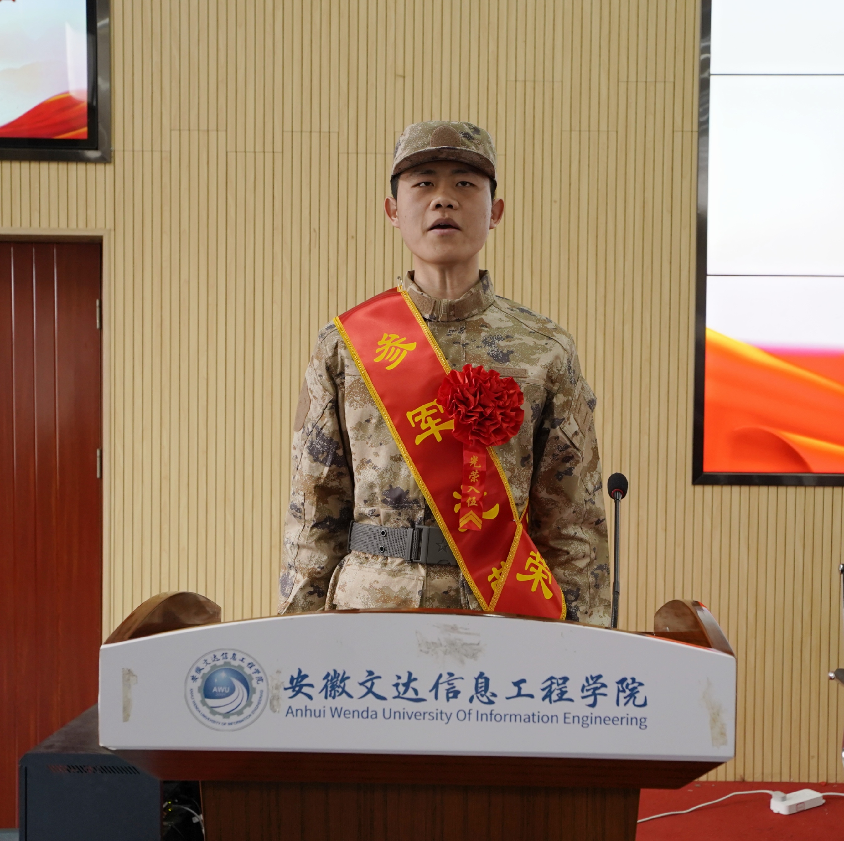 会议在庄严雄壮的国歌声中拉开序幕。党委副书记、副校长、纪委书记唐立军宣读《关于表彰安徽文达信息工程学院2024年春季参军入伍大学生的决定》,授予预定新兵同志“参军报国优秀大学生”荣誉称号,并对40名文达青年应征入伍表示祝贺。