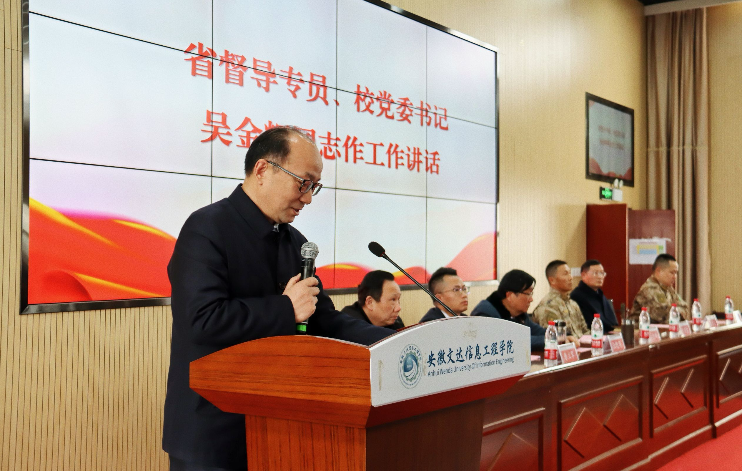 安徽省督导专员、校党委书记吴金辉向40名通过层层选拔、即将踏上征程的“准新兵”们表示热烈祝贺并提出三点希望和要求。一是希望同学们树立坚定的理想信念,厚植爱国情怀。坚定不移听党话、跟党走,把满腔热血化为报国之志,让青春芳华在逐梦强军的火热实践中绽放绚丽之花。二是希望同学们练就过硬本领,成长为党和人民可信赖的战士。要努力学政治、练军事、强本领,汲取更多的成长养分,争当训练尖子、技术能手、精武标兵,努力成为有灵魂、有本事、有血性、有品德的新时代军人。三是希望同学们始终保持学习“在线”的状态,养成主动学习、持续学习的习惯。在理论素质、军事技能等各个方面认认真真学、与时俱进学、持之以恒学,让自己成为同袍中的佼佼者,才能在机会到来的时候稳稳抓住,书写出属于自己的辉煌篇章。
