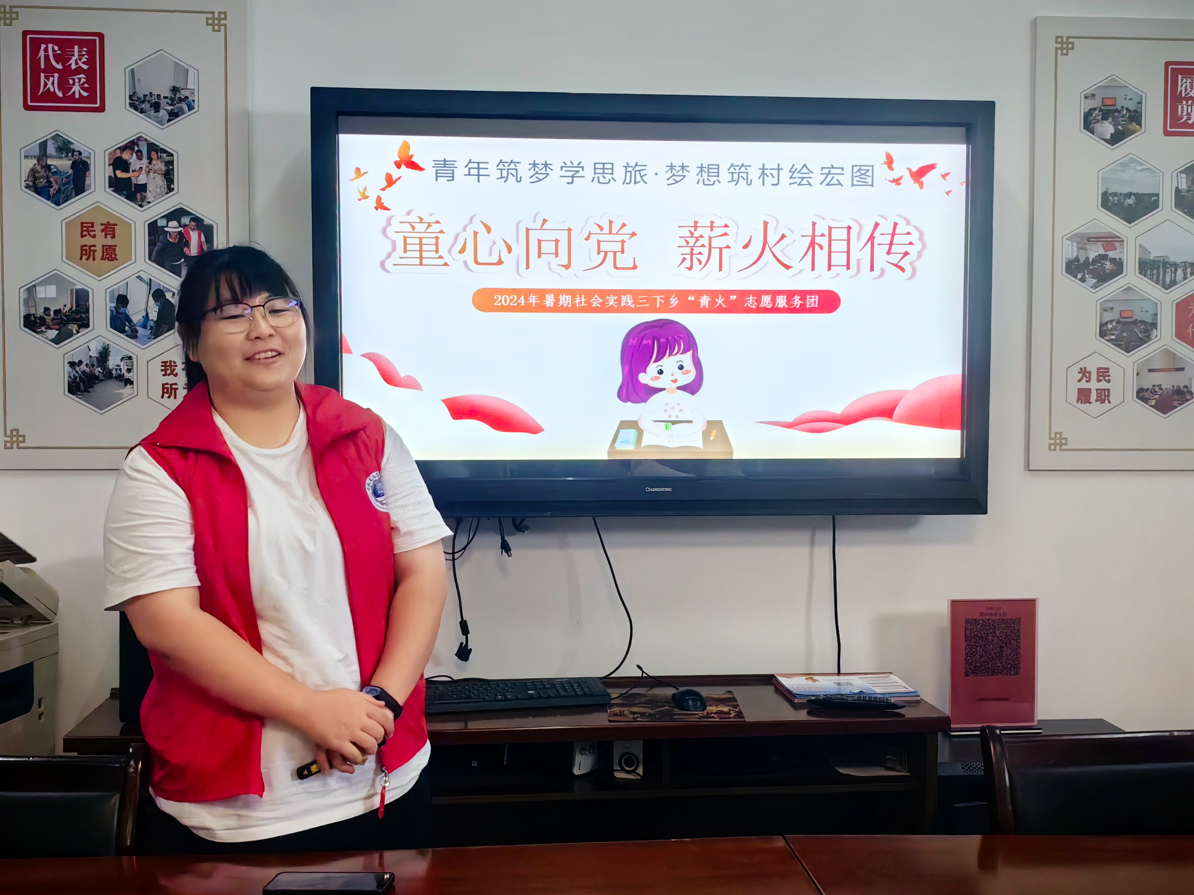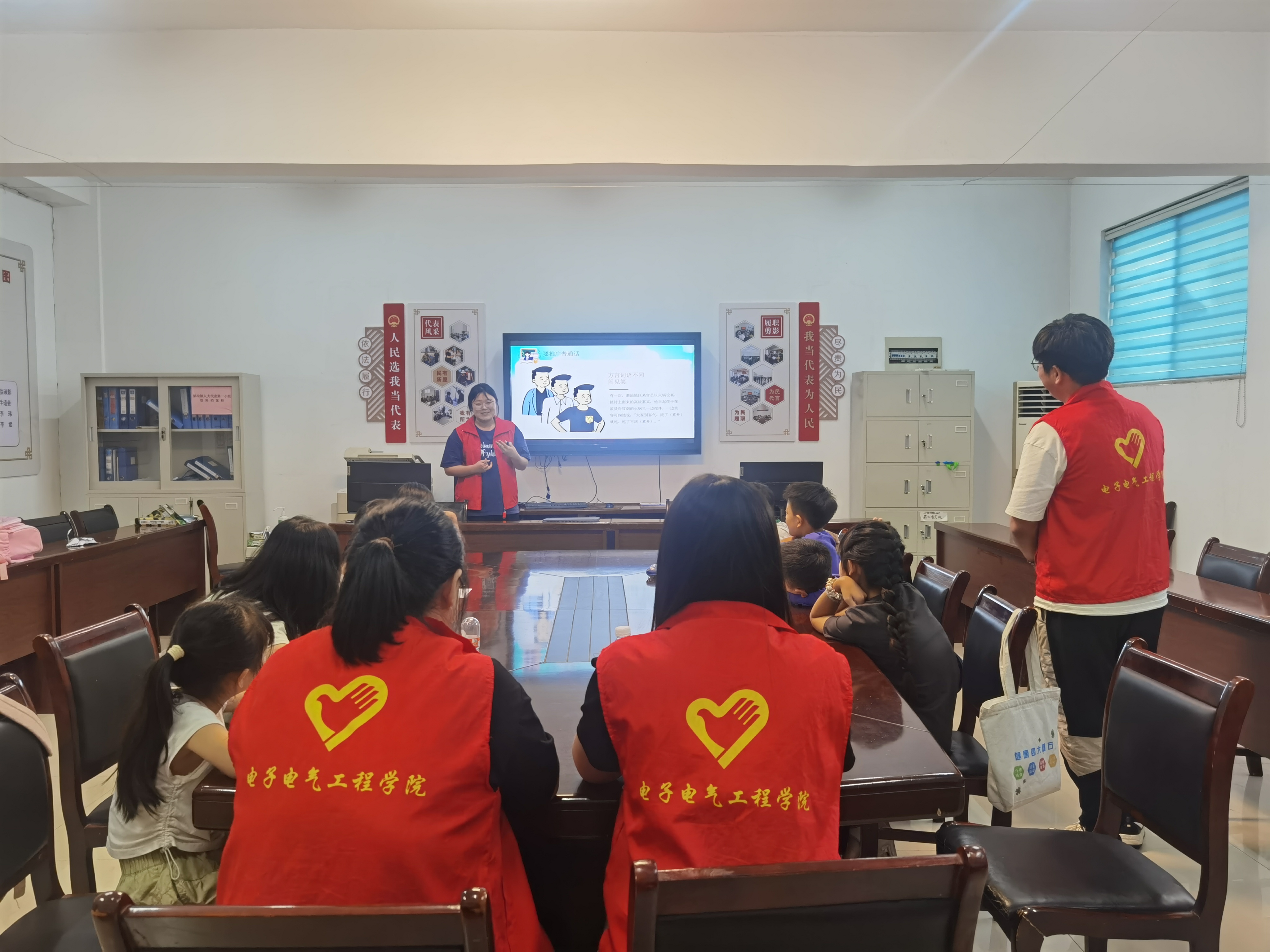 语言百用增技能,乡村课堂巧推普。为深入学习和宣传阐释习近平总书记关于推广国家通用语言文字的重要指示批示精神,推动中华经典诵读工程更好服务乡村振兴战略,结合乡村振兴战略和新发展理念需要,立足当地特色,切实发挥语言文字的基础性作用,助力乡村文化振兴。实践团成员联合渠沟镇桥头村开展“暑期推普小课堂”、“防溺水宣讲小课堂”、“童心向党 薪火相传”党史故事主题宣讲,通过开好一堂课,讲好一句话,唱好一首歌,助力儿童学习。课堂中,实践团成员们采取绕口令、猜字谜、字形规范、歇后语等多种形式开展实践教学,进一步激发儿童青少年们讲好普通话的兴趣与动力,帮助其掌握正确发音,增强他们的语言表达能力和交流能力。结合汛期实际,积极开展防溺水安全科普,增强儿童青少年在意外溺水时自救的意识,保障青少年儿童的生命安全。同时,开展党史故事宣讲,组织儿童唱响《中国少年先锋队队歌》,“我们是共产主义接班人,继承革命先辈的光荣传统,爱祖国,爱人民,鲜艳的红领巾飘扬在胸前……”飘扬在会议室上空。伴随着激昂旋律,渠沟镇桥头村的少先队员们,用歌声表达对党的敬意和听党话、跟党走的决心。